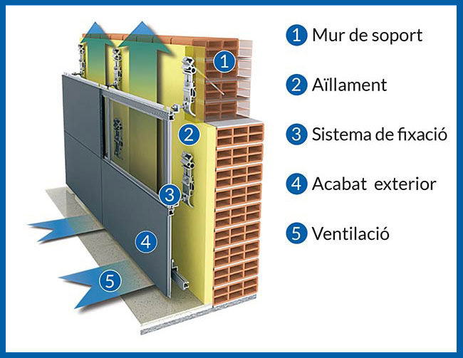 El sistema de façana ventilada consta de un mur de suport (1), una capa d’aïllant (2) ancorat sobre el suport i una capa de revestiment vinculada a l’edifici mitjançant un sistema de fixació, generalment d’alumini (3). Entre l’aïllant i el revestiment es crea d’aquesta manera una cambra d’aire que activa una eficaç ventilació natural (5), de baix cap a dalt, mantenint l’aïllament sec i aconseguint d’aquesta forma un gran estalvi en el consum energètic. L’acabat exterior (4), majoritàriament d’origen ceràmic, té una elevada qualificació física i una llarga durabilitat garantida.